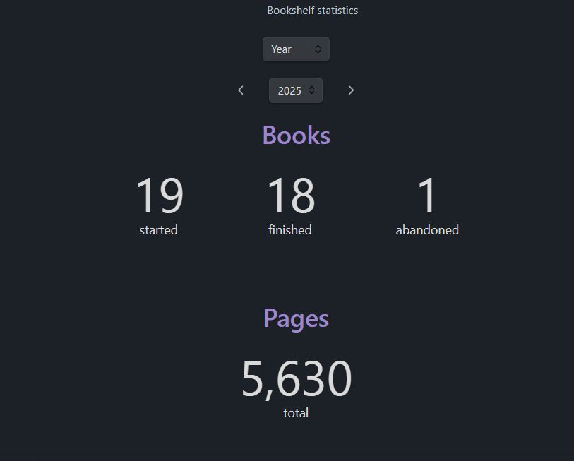 This year I am not using only Goodreads for yearly books review, I am using also the Bookshelf plugin in Obsidian. I still use Goodreads for checking the books reviews and add the books that I want to read. The main difference of the stats is that in Obsidian I track all readings, including pages of books I abandoned and the ones that are not finished during the year. So the stats are more accurately.